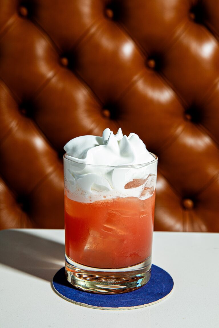 bourbon, carpano antica, campari, fresh lemon juice, egg white